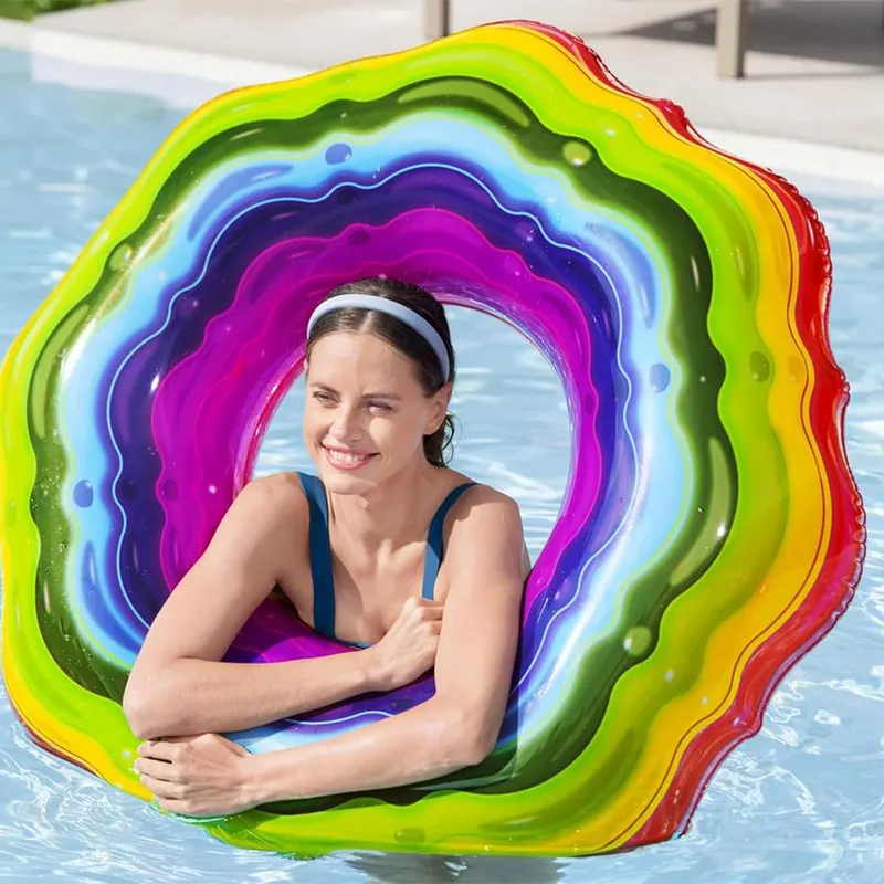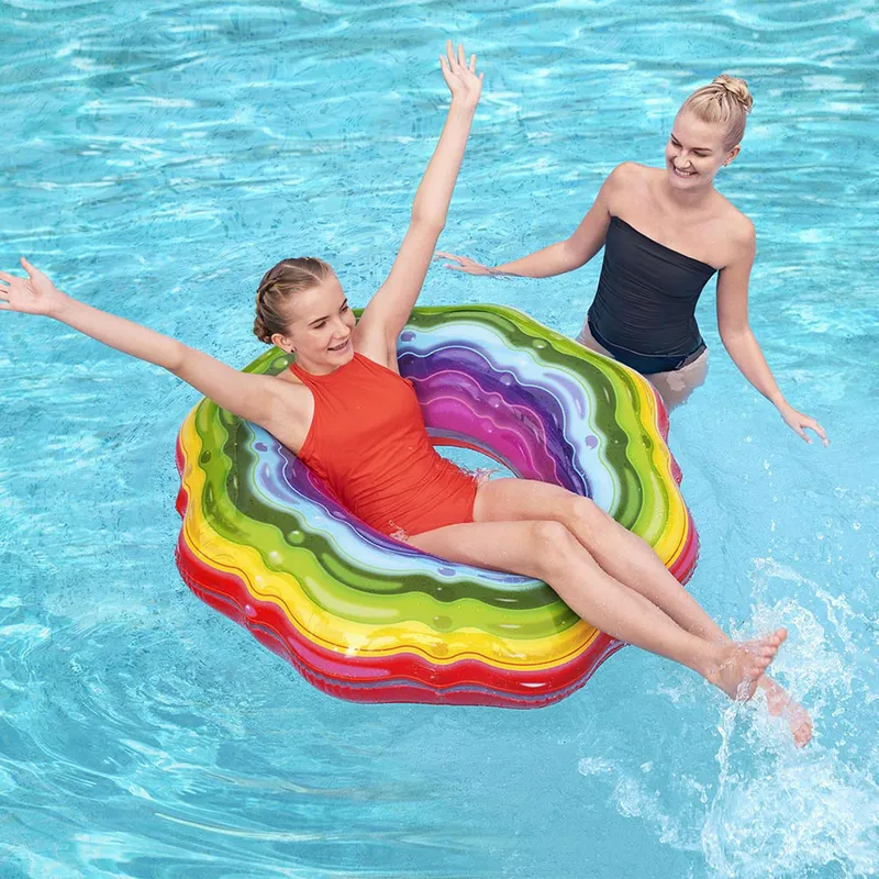 الأبعاد: ١١٥ سم الخامة: فينيل الاستخدام: حمامات السباحة، البحيرات، أو الشاطئ لحام بالموجات فوق الصوتية عالية التردد صمام أمان اللون: تصميم قوس قزح