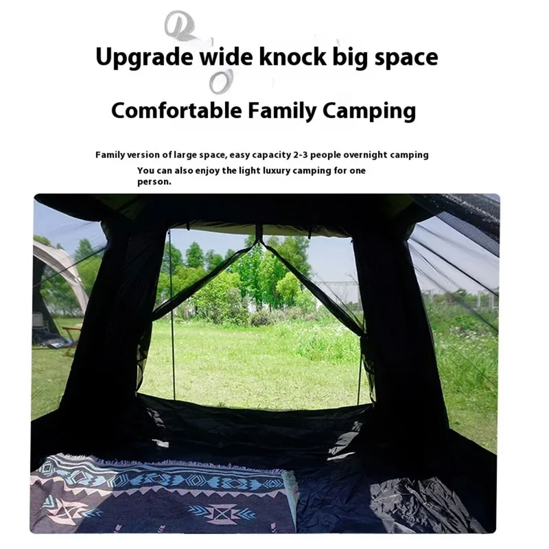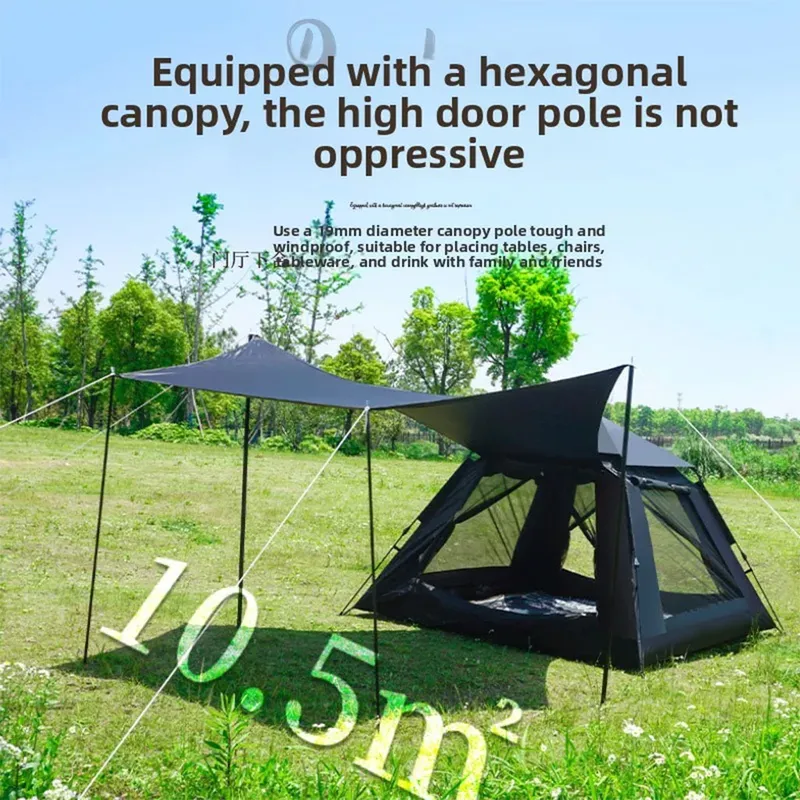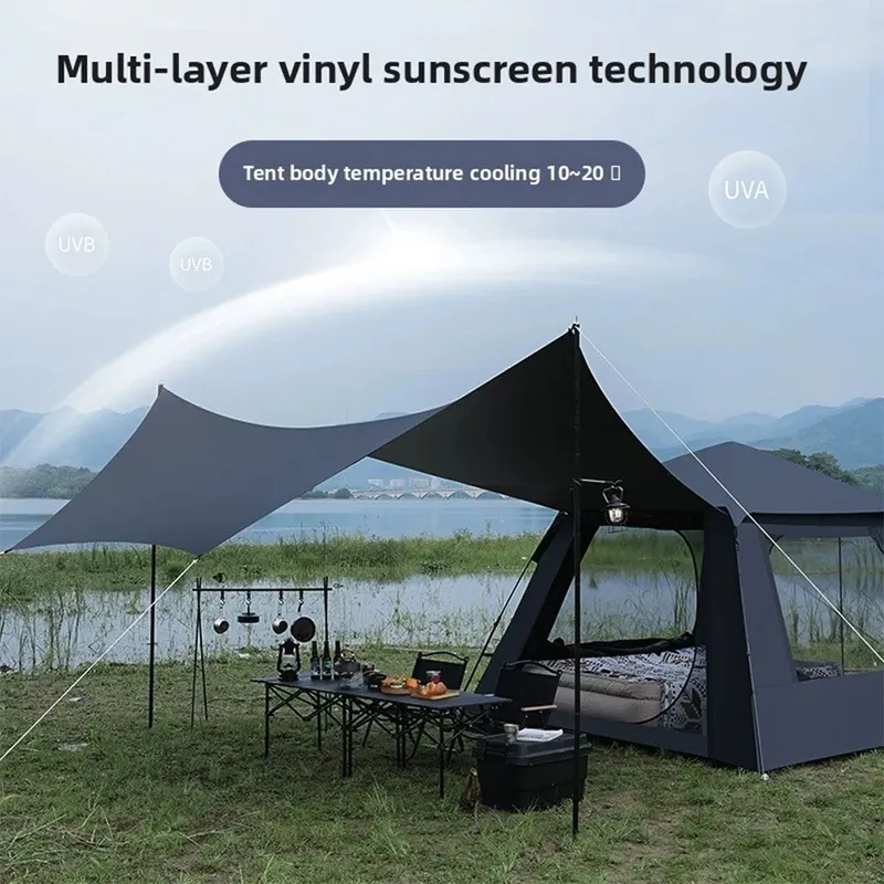 يمكن ربط الخيمة والمظلة معًا بسحاب أو استخدامهما بشكل منفصل. يمكن دعم باب الخيمة بأعمدة ليعمل كشرفة، مما يوفر ظلًا إضافيًا. يحمي التصميم المقاوم للمطر تمامًا الجزء الداخلي للخيمة بفعالية من تسرب مياه الأمطار في الأيام الممطرة. يوفر بابان ونافذتان تهوية ثلاثية الأبعاد. توفر ناموسية رباعية الجوانب حماية ممتازة من البعوض. يوفر مزيج قماش 210T OX وطبقة التعتيم الكاملة حماية استثنائية من الشمس وعزلًا حراريًا.